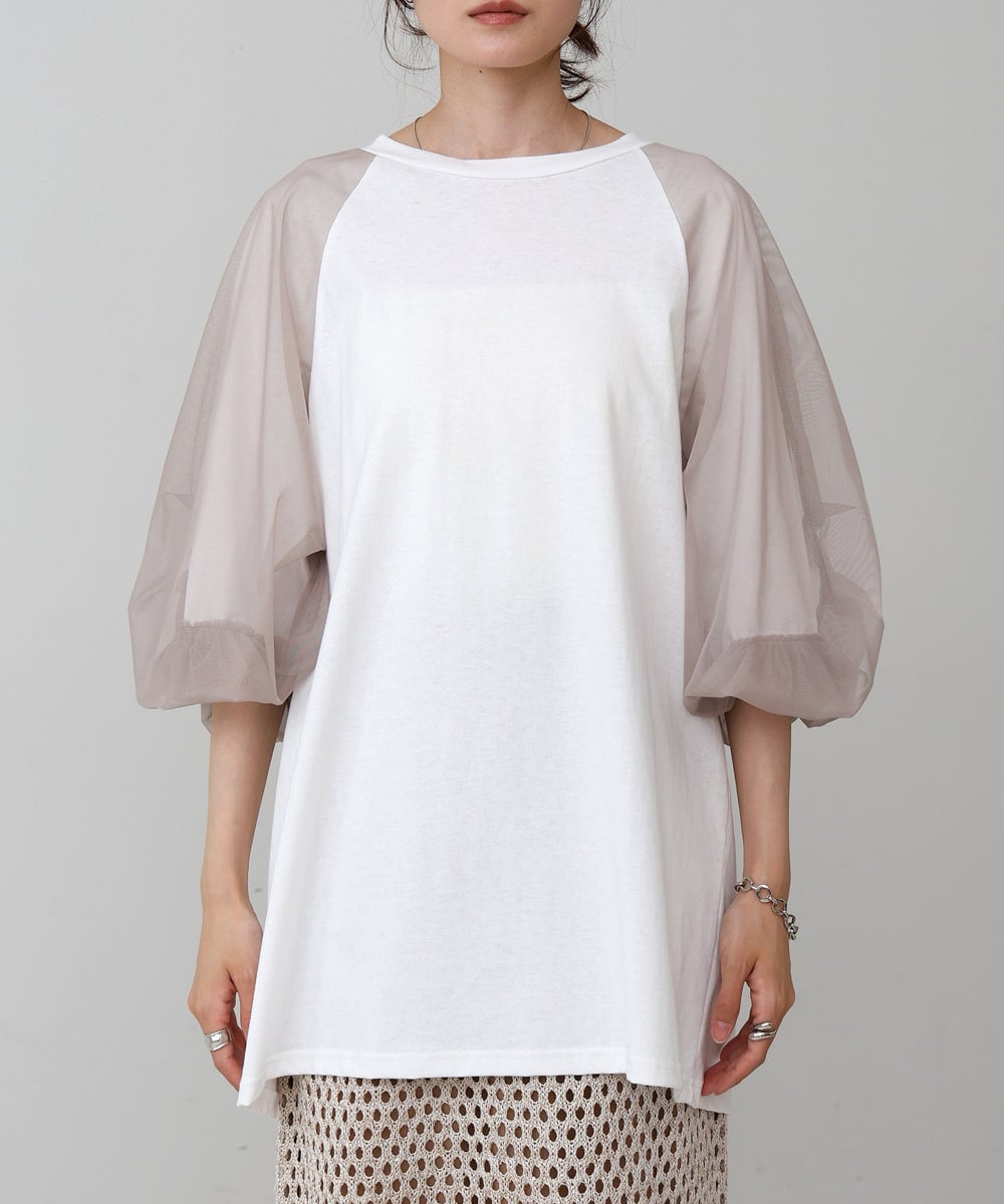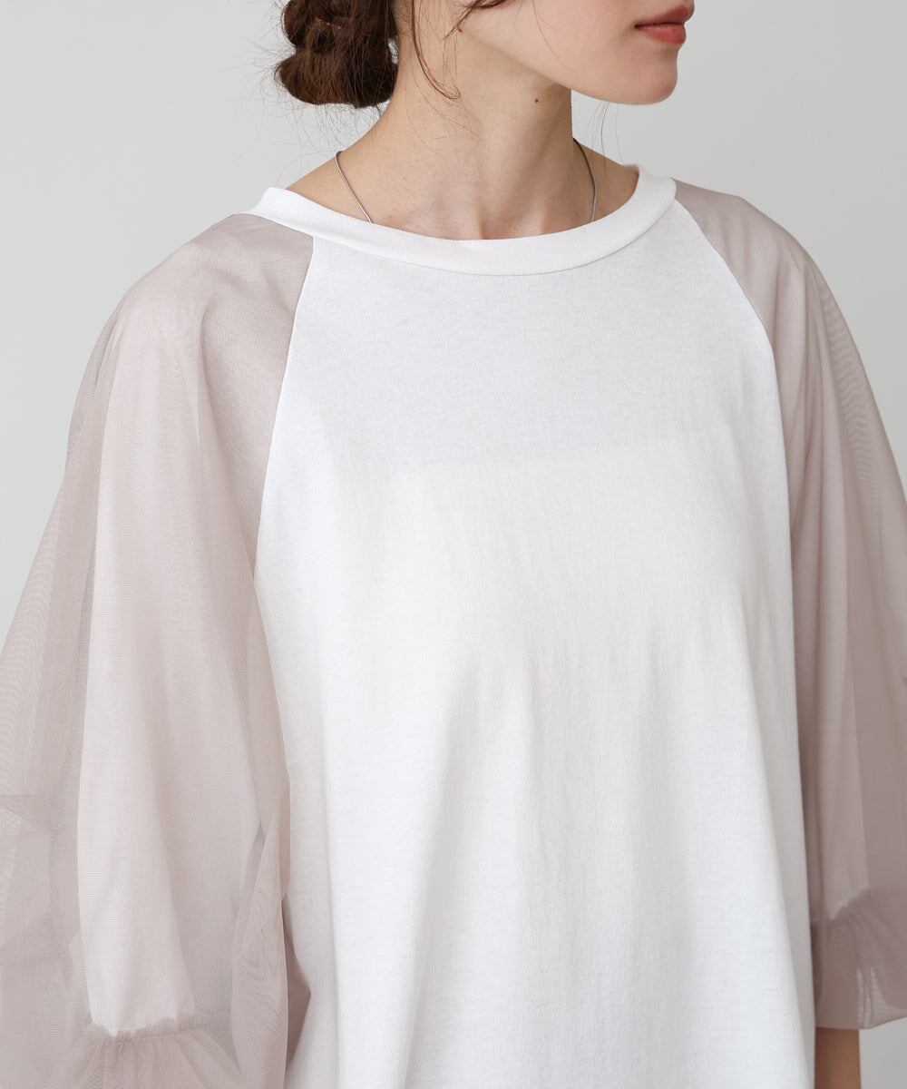 イージーな着心地の薄手天竺と、袖にはチュールを重ねた着映え抜群の1枚が出来上がりました!ラグランスリーブの程よくルーズなシルエットがこなれ感を演出し、ギャザーたっぷりに施したボリューム袖が女性らしい雰囲気に。ボトムスの雰囲気によってお出かけスタイルからデイリー使いまで幅広くコーディネートできる万能なアイテムです。