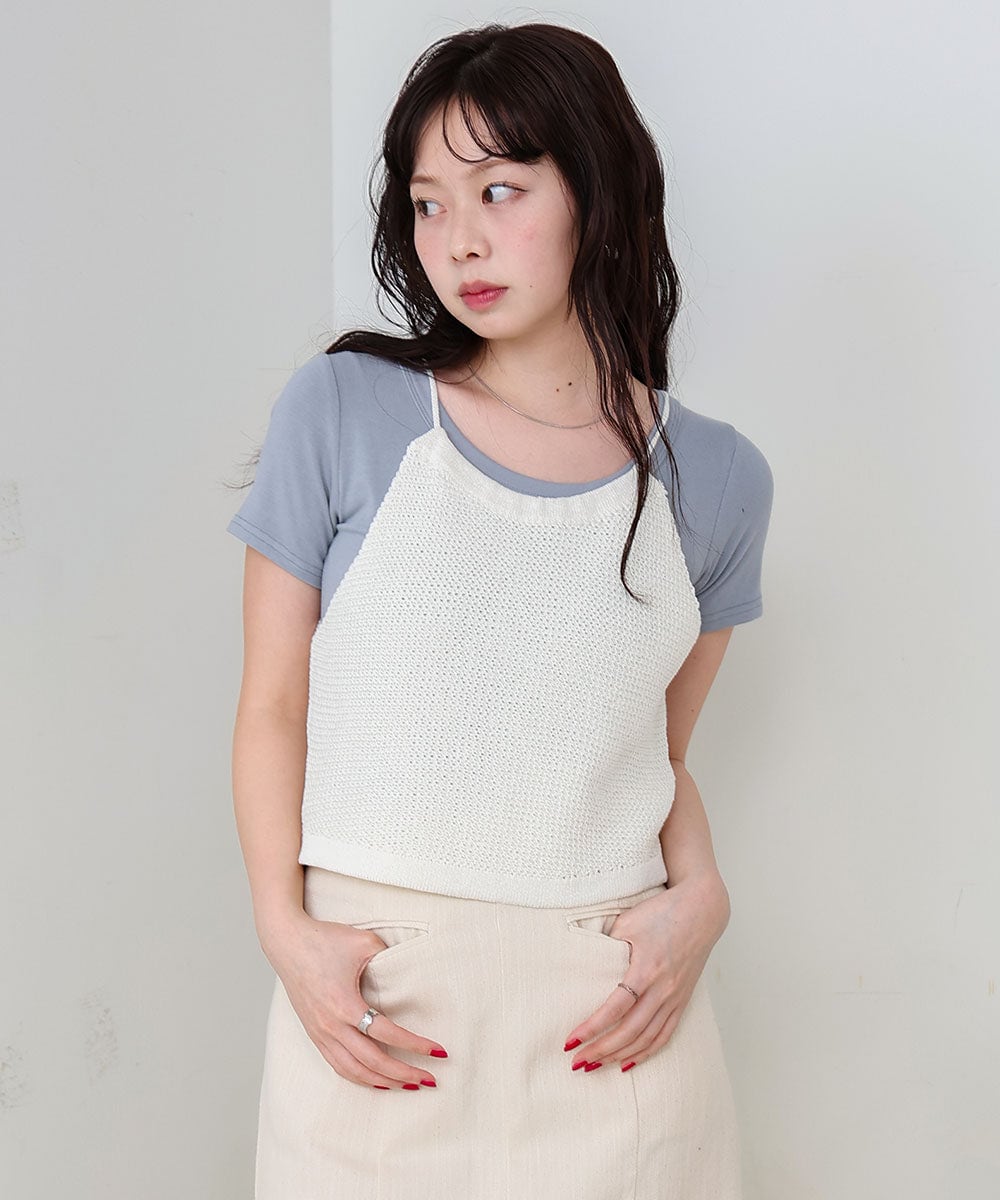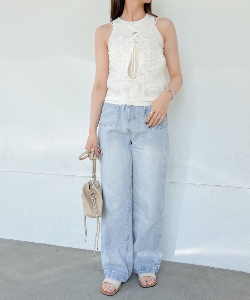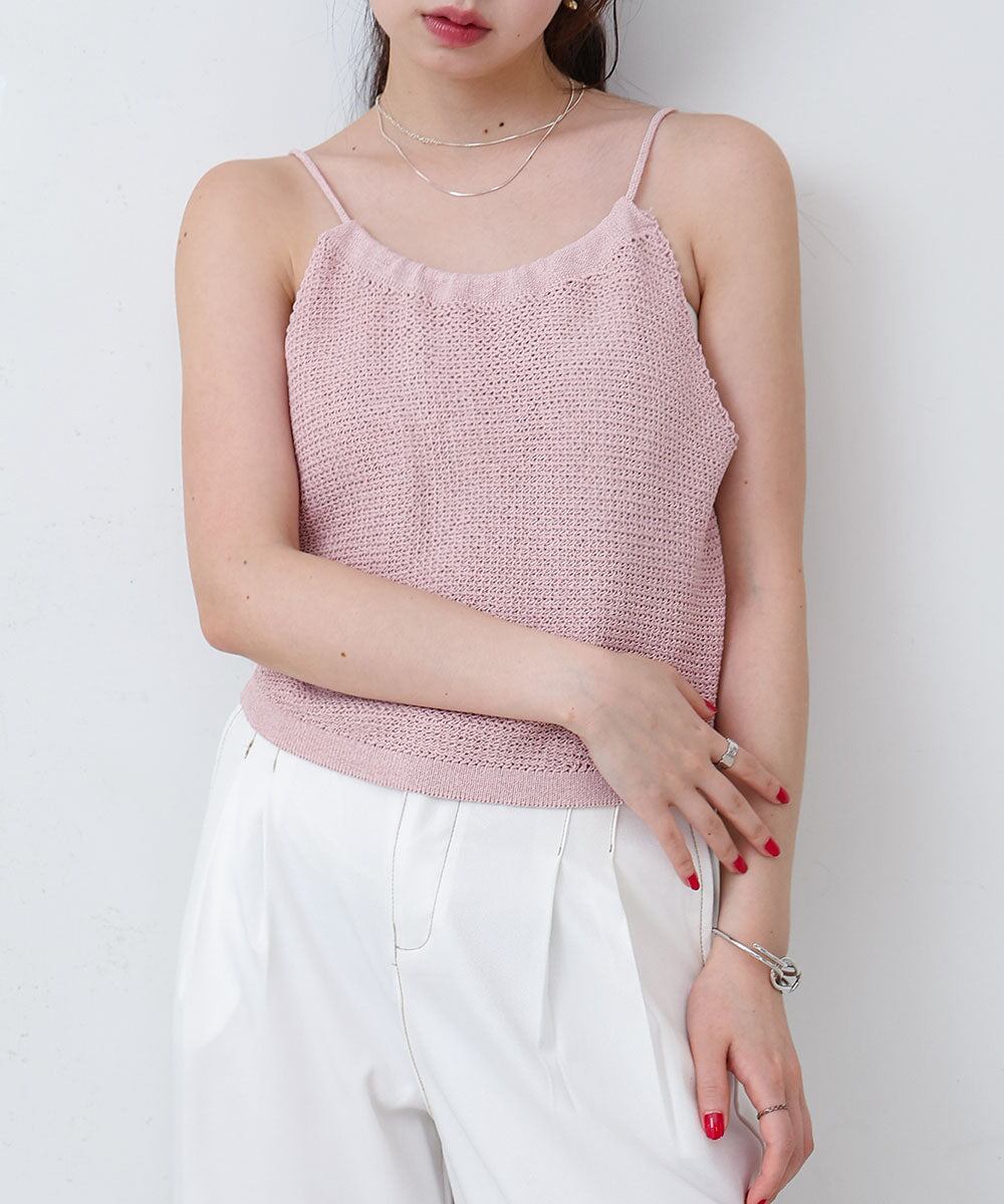 編地のようなさらっとした表面感で涼しげなサマースタイルが完成します。細めの肩ひもで華奢見えし女性らしさをより演出できる1枚。リボンは前後どちらでも◎気分に合わせてお楽しみいただけます。