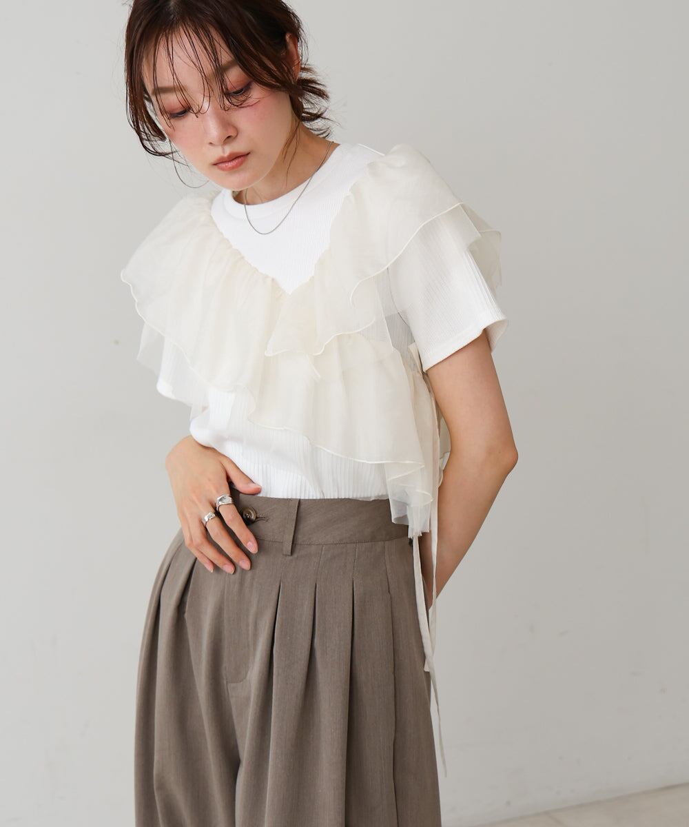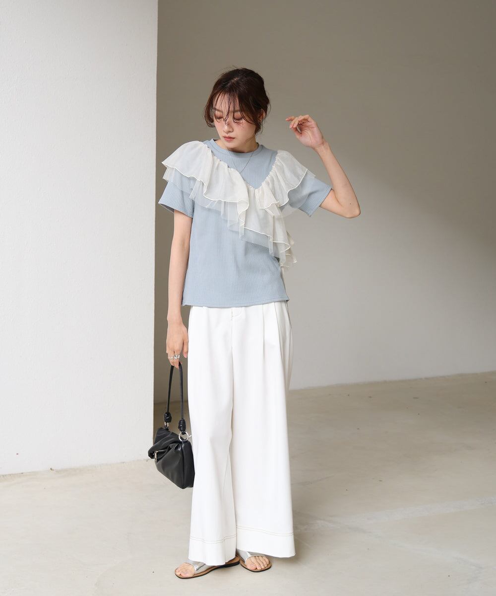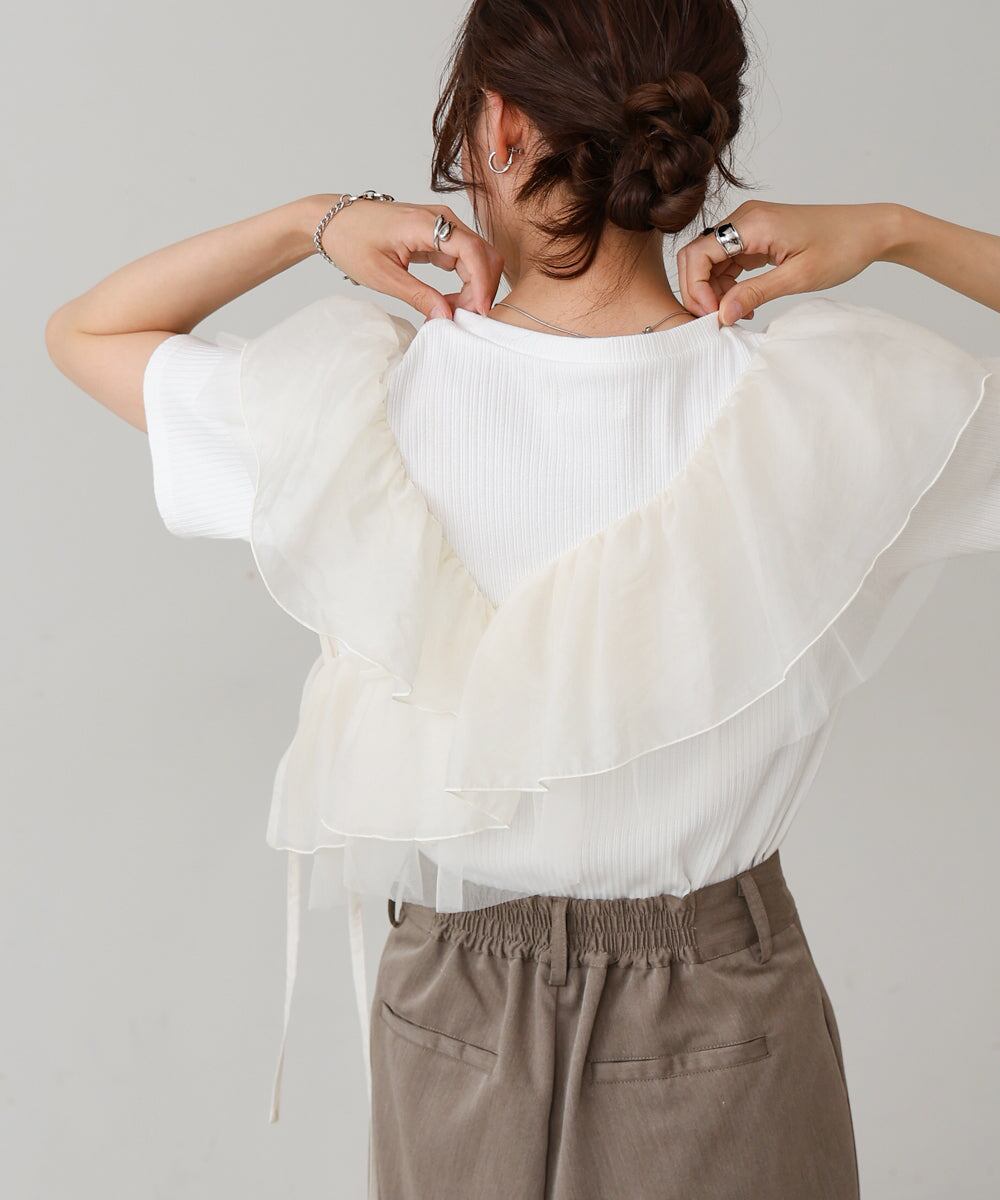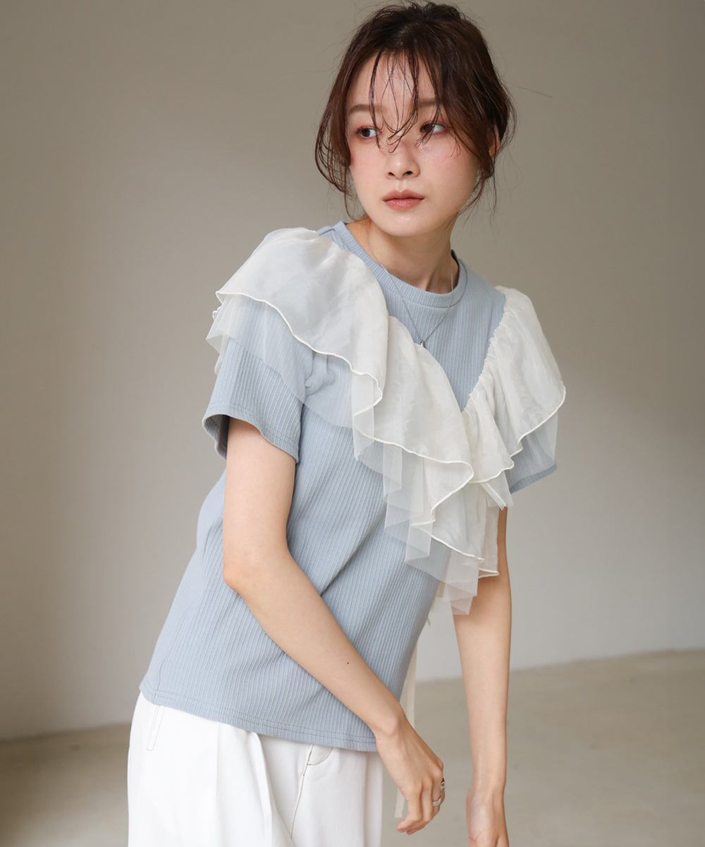 シンプルなリブカットソーにトレンドのフリルデザインをドッキングさせた 着映え抜群のトップスです。フリル部分はオーガンジーとチュールの2枚仕立てでフェミニンさ際立つボリューム感があり、アシンメトリーのディティールでこなれ感も演出できます。