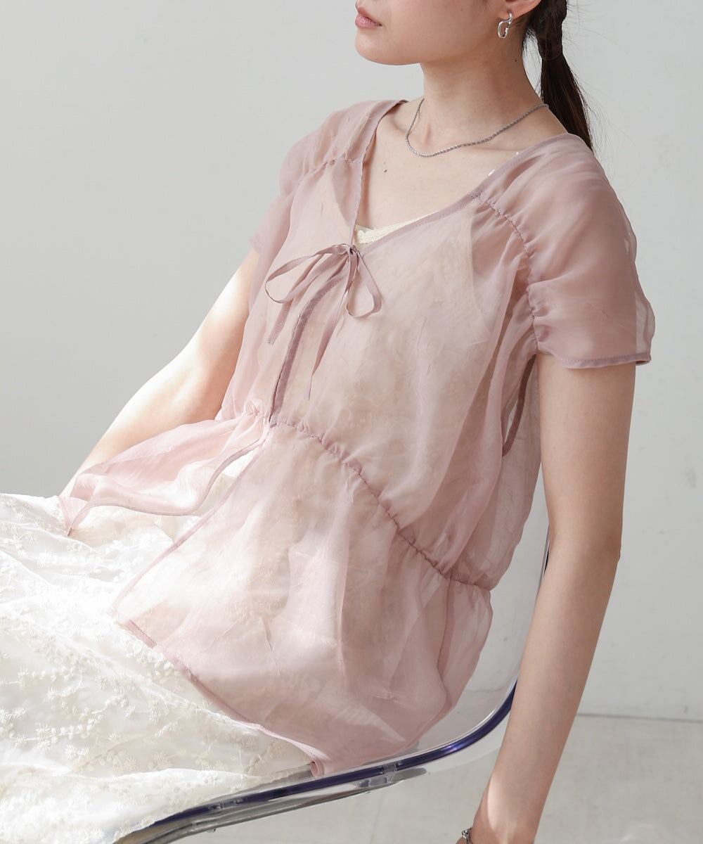 昨年も大人気だったシアーブラウスが新カラーでアップデート!前後2WAYで気分に合わせて着用頂けます。シワ加工したオーガンジー素材を使用し、立体感より出るような素材をチョイス。たっぷりギャザーを寄せた仕様も女性らしい印象に。フロント部分のリボンは結んでも垂らしても◎。リボン結びだとより可愛らしい見た目に。気になる二の腕部分も自然と隠してくれるので、キャミソール系のアイテムの羽織にぴったりです。