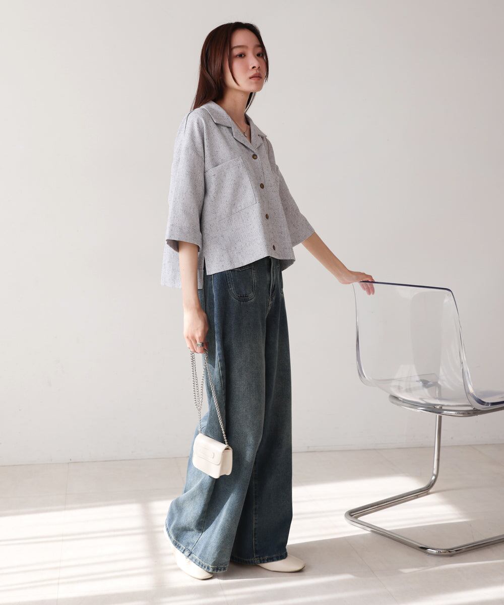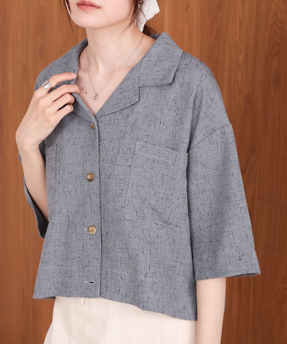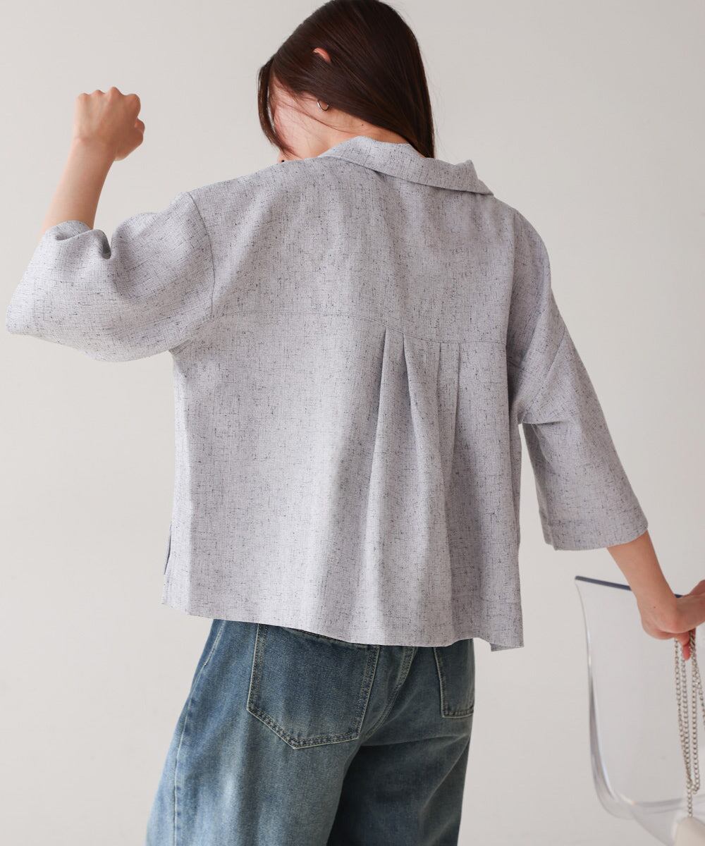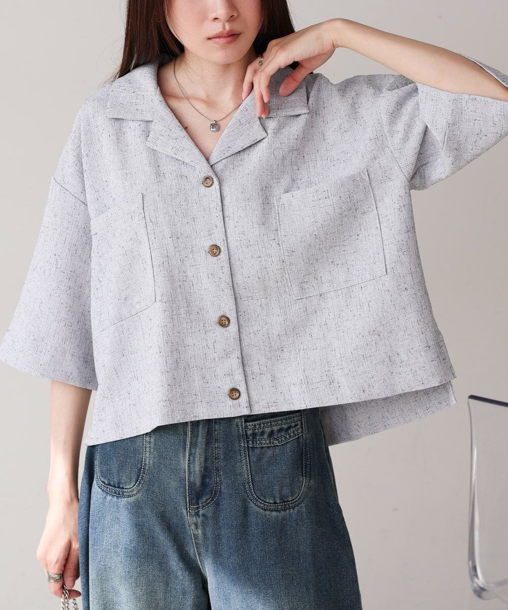 自然体なムードを楽しめるオープンカラーシャツが、抜け感たっぷりのハーフスリーブで登場しました!短めの着丈でウエストの華奢見えも期待できます。背中のタックでシルエットに丸みを持たせ、メンズライクに寄りすぎず 可愛らしさも抜かりなく演出。フロントに大胆にあしらったスクエアタイプのポケットもアイキャッチになります。