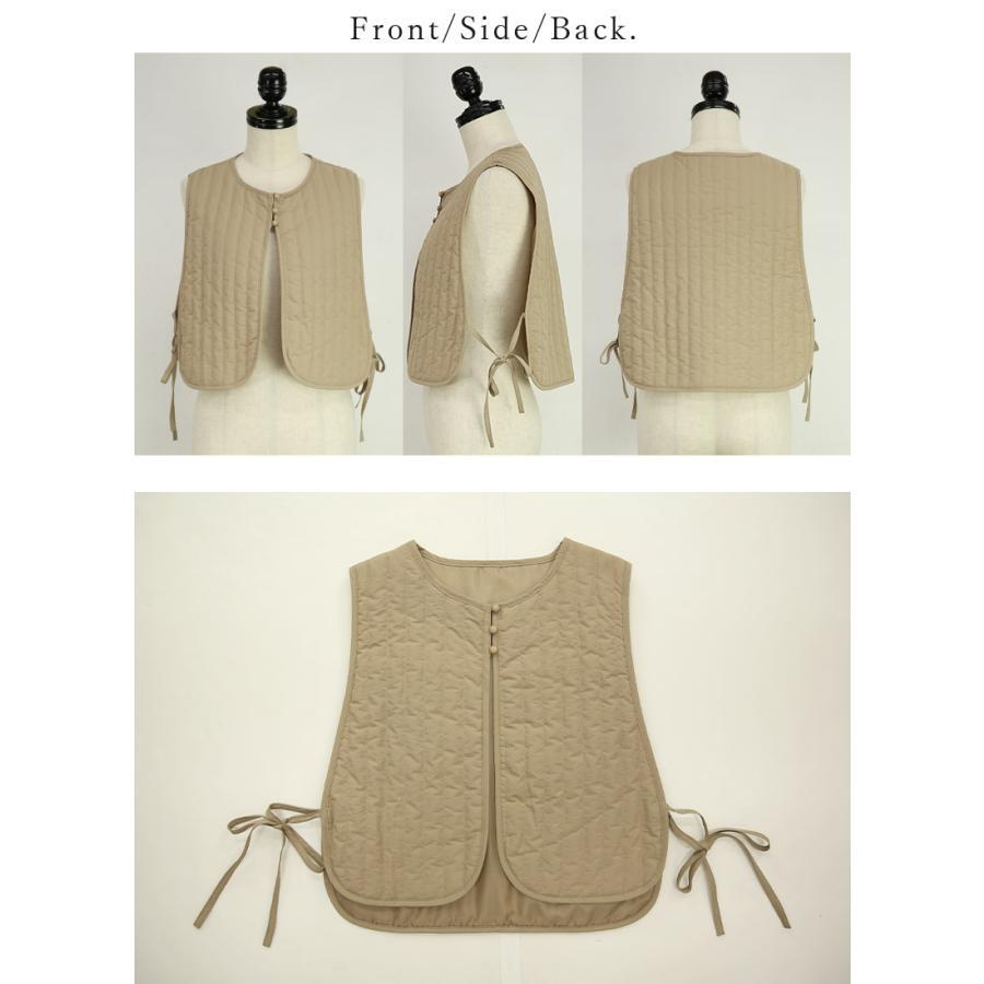 キルティング素材が可愛く両サイドのリボンがポイント♪普段のスタイリングにプラスするだけで手軽にトレンド感をプラスできるショート丈ジレです。